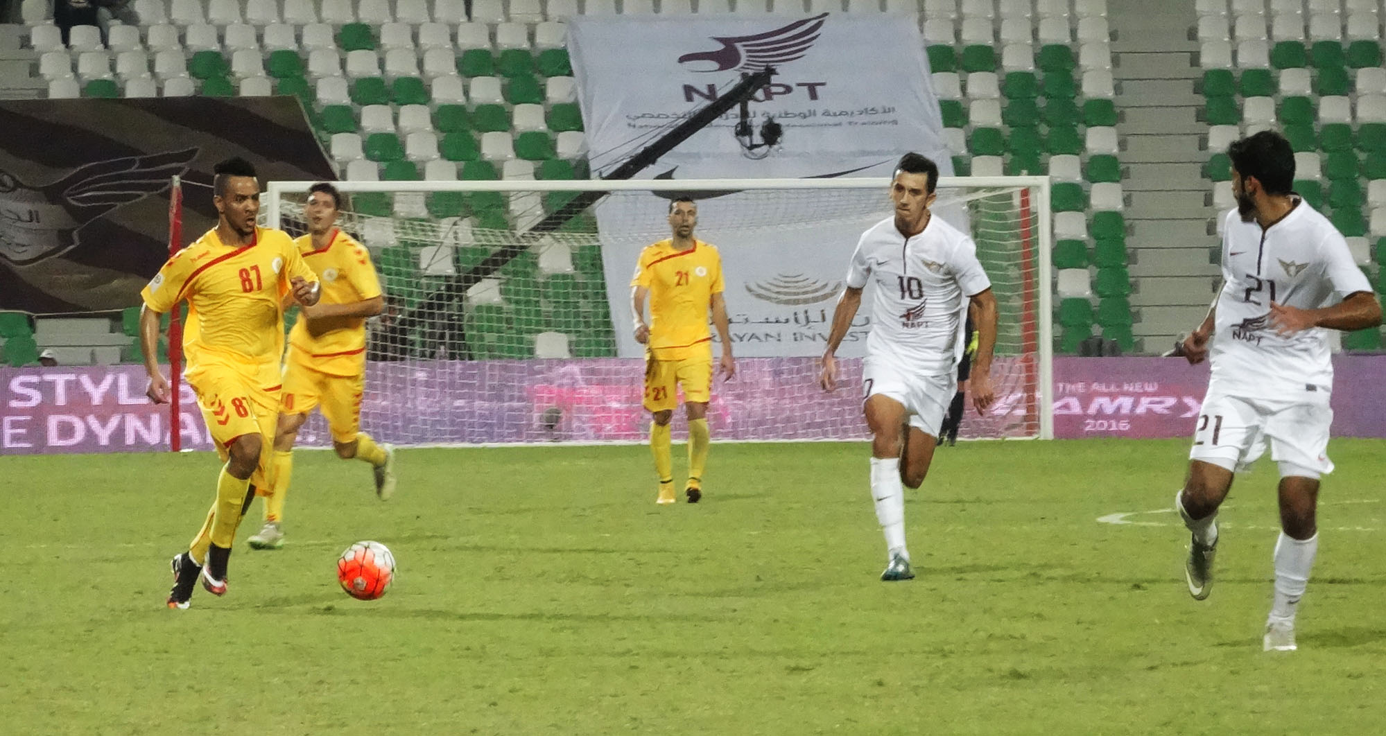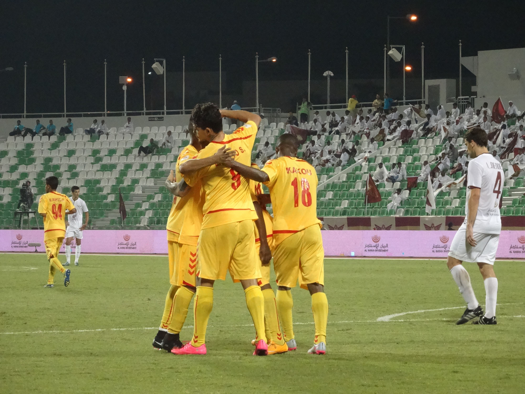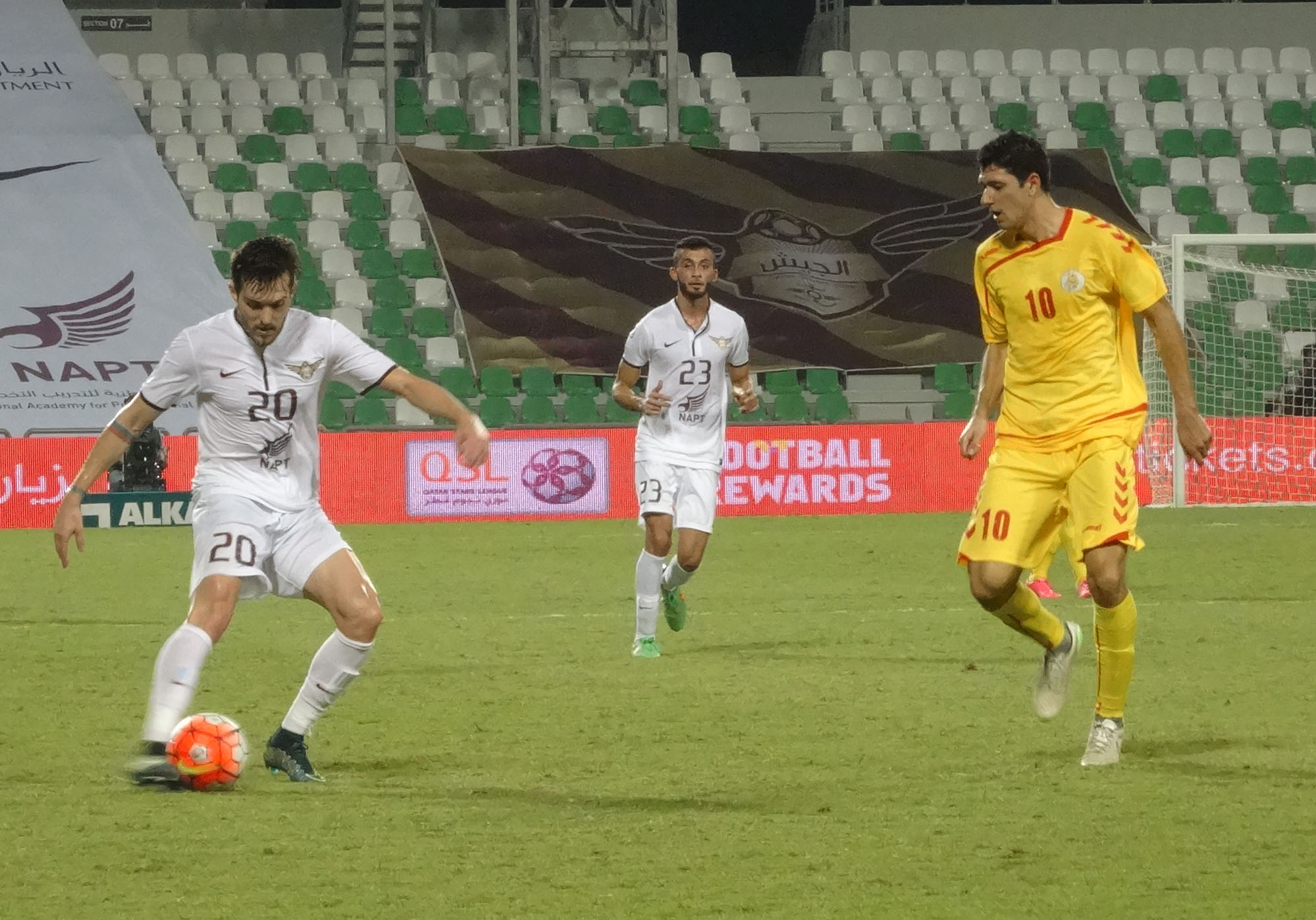 تاريخ الإضافة : 2015-11-07فاز الجيش علي مسيمير 5-2 اليوم السبت في ختام المرحلة الثامنة من دوري نجوم قطر, وسجل اهداف الجيش البرازيلي رومارينيو ريكاردو (10 و44) والاوزبكستاني ساردور راشيدوف (14 و36) وماجد محمد (87)، ولمسيمير عبد الرحمن سمير (35 ) والبرازيلي اريفيلتو اميلانو دا سيلفا (85). وبهذا الفوز احتل الجيش المركز الثاني بفارق 4 نقاط فقط عن الريان متصدر الجدول بعد ان رفع رصيده الى 20 نقطة بينما تجمد رصيد مسيمير عند 3 نقاط في المركز الاخير.