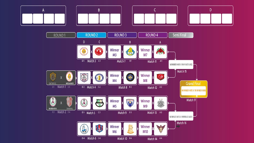 وتم سحب الفرق في القرعة بناء على تصنيف الاتحاد ، وكان السحب أولاً على فرق المستويين الرابع والثالث ، وأسفرت القرعة عن مواجهة مسيمير مع العربي في المرحلة الثانية من البطولة ومعيذر مع الخور والمرخية مع الأهلي والوكرة مع الشحانية.