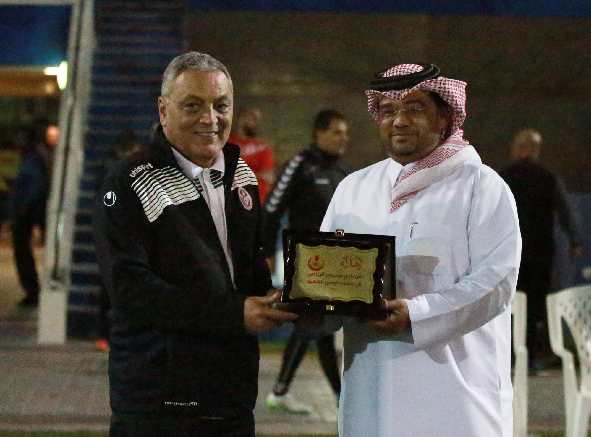 تاريخ الإضافة : 2018-01-15خسر فريق مسيمير اليوم من منتخب نسور قرطاج 6- 0 في لقاء ودي تحدى فيه مسيمير قدارته ليبارز فريق مرشح لخوض بطولة كأس العالم القادمة ورغم الخسارة إلا أن فريقنا ظهر بالمظهر اللائق لفريق لا يستهان بيه ونال أداؤه استحسان الحاضرين , وترحيبا بالمنتخب التونسي العريق تبادل مسؤالي الفريقين الهدايا التذكارية تخليدا لهذا اللقاء التاريخي.