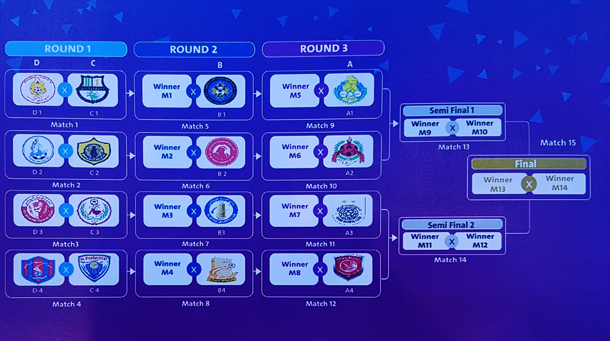 والريان من المجموعة الثانية ( قطر مع الوكرة والفائز منهما مع العربي ) ، والسد من المجموعة الثالثة ( المرخية مع الشمال والفائز منهما مع الخور ) ، وأخيراً الدحيل من المجموعة الرابعة ( الخريطيات مع الشحانية والفائز منهما مع أم صلال ) .