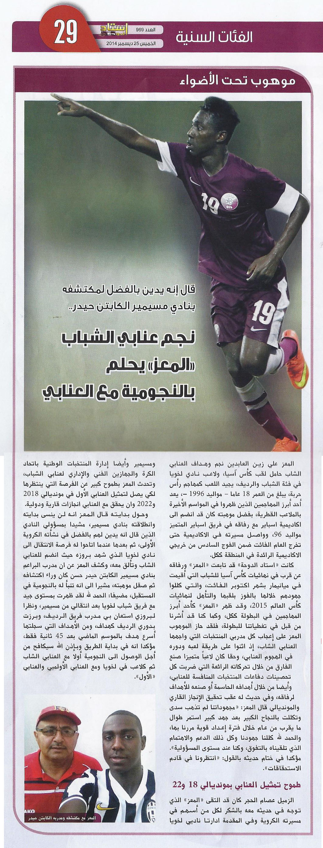 ذكرت مجلة إستاد الدوحة الصادرة اليوم الخميس على لسان نجم المنتخب العنابي للشباب المعز علي زين العابدين  نجم وهداف العنابي الشاب حامل لقب كأس آسيا وصاحب أسرع هدف بالموسم الماضي في معرض حديثه عن بداية مسيرته الكروية حيث قال أنه لن ينسى بدايته وانطلاقته بنادي مسيمير مشيدا بمسؤولي النادي الذين قال أنه يدين لهم بالفضل في نشأته الكروية الأولى , ثم بعدها عندما أتاحوا له الفرصة الإنتقال إلى نادي لخويا الذي شهد بروزه حيث إنضم للعنابي الشاب وتألق معه , وكشف المعز عن أن مدرب البراعم بنادي مسيمير الكابتن حيدر حسن كان وراء إكتشافه ثم صقل موهبته , مشيرا إلى أنه تنبأ له بالنجومية في المستقبل .